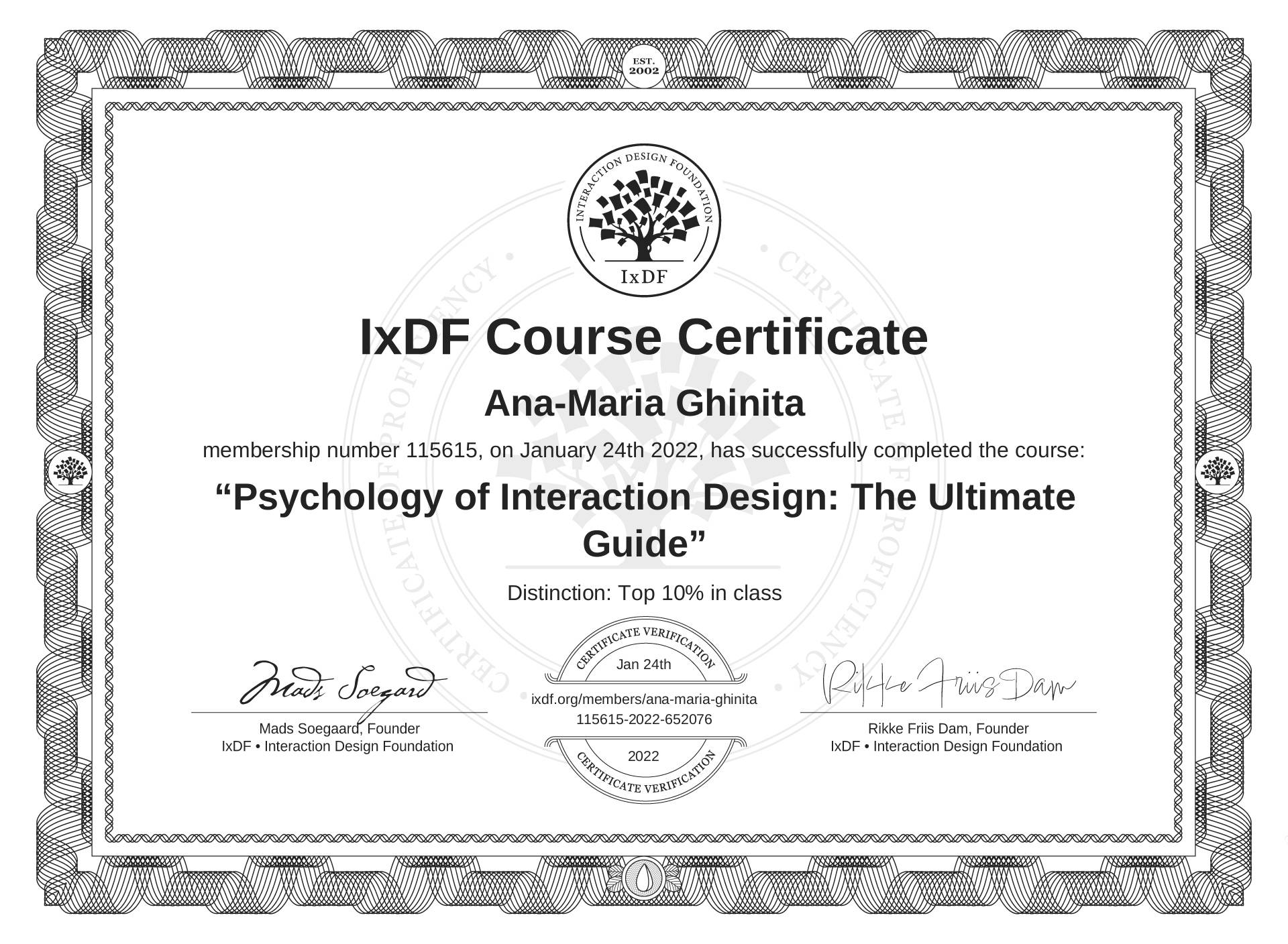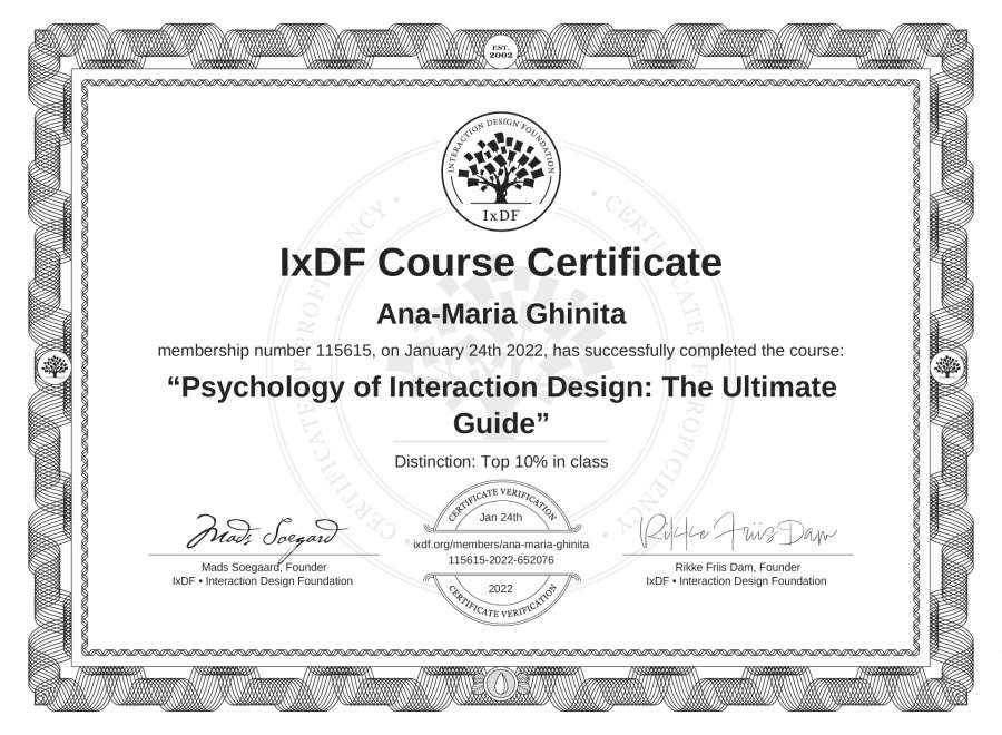 Ana-Maria Ghinita's IxDF Course Certificate: Psychology of Interaction Design: The Ultimate Guide