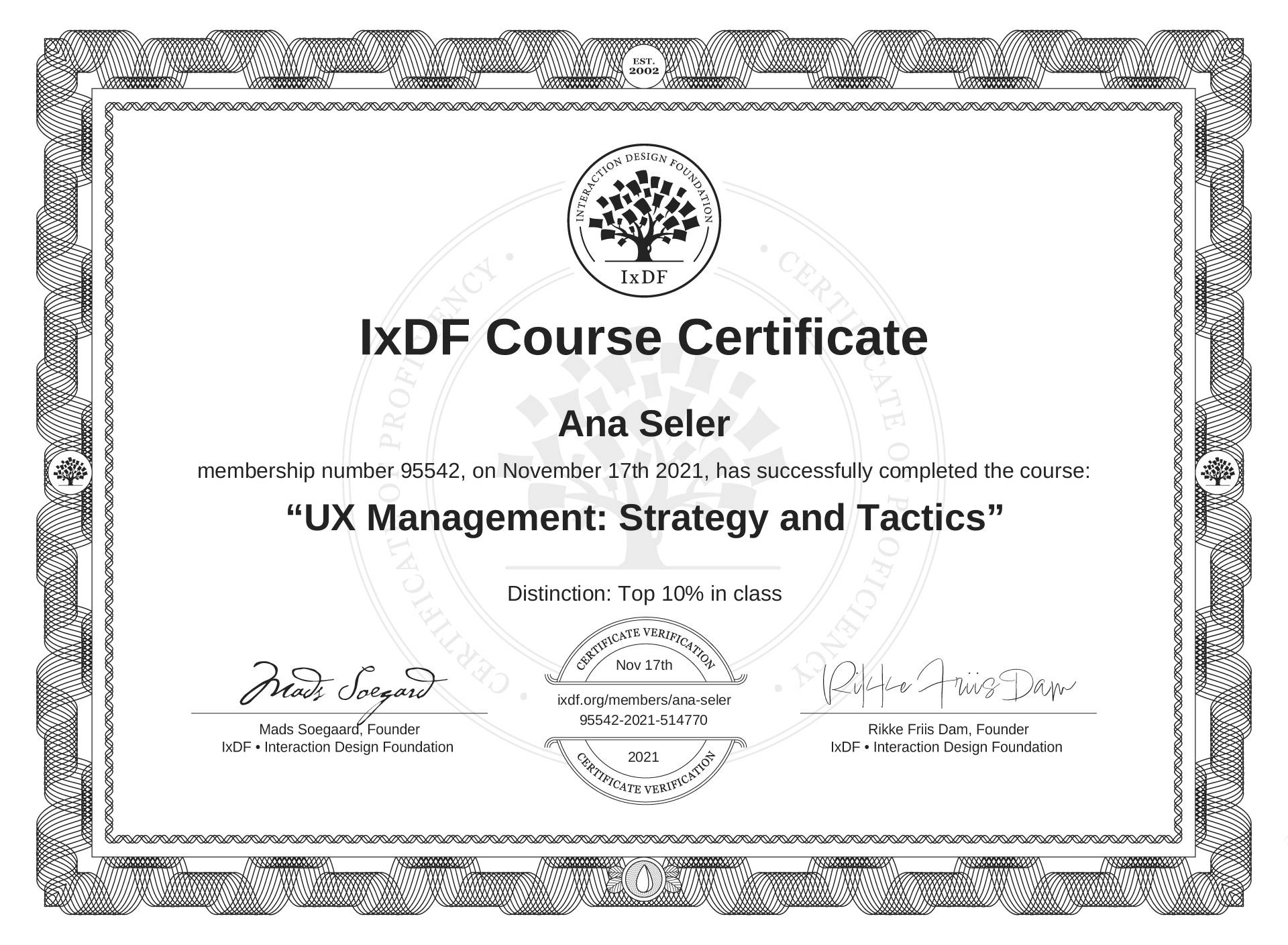 The IxDF Course Certificate above is awarded to Ana Šeler with a Top 10% Distinction in formal recognition of their coursework surpassing the rigorous benchmarks of exceptional performance established by the IxDF Educational Codex.