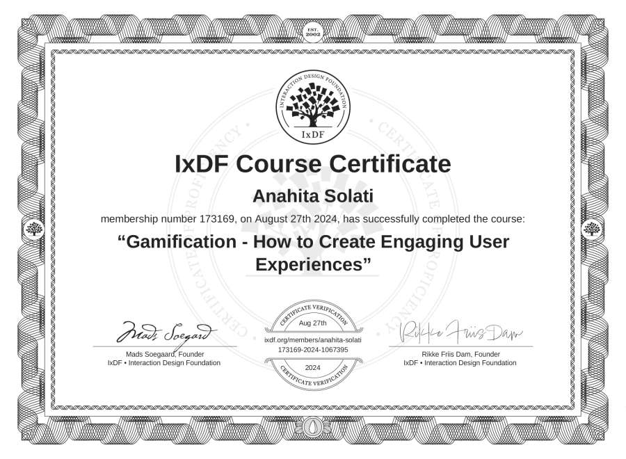 Anahita Solati's IxDF Course Certificate: Gamification - How to Create Engaging User Experiences