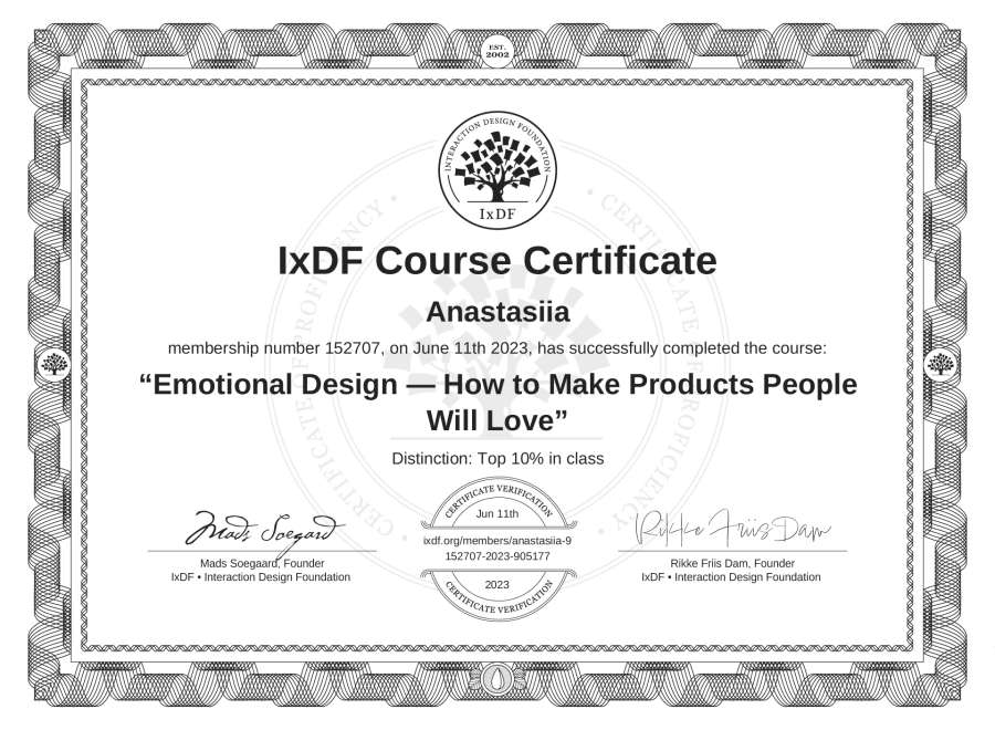 Anastasiia's IxDF Course Certificate: Emotional Design — How to Make Products People Will Love