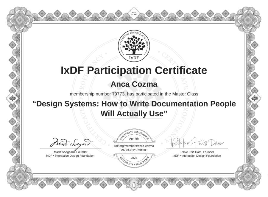Anca Cozma's IxDF Masterclass Certificate: Design Systems: How to Write Documentation People Will Actually Use