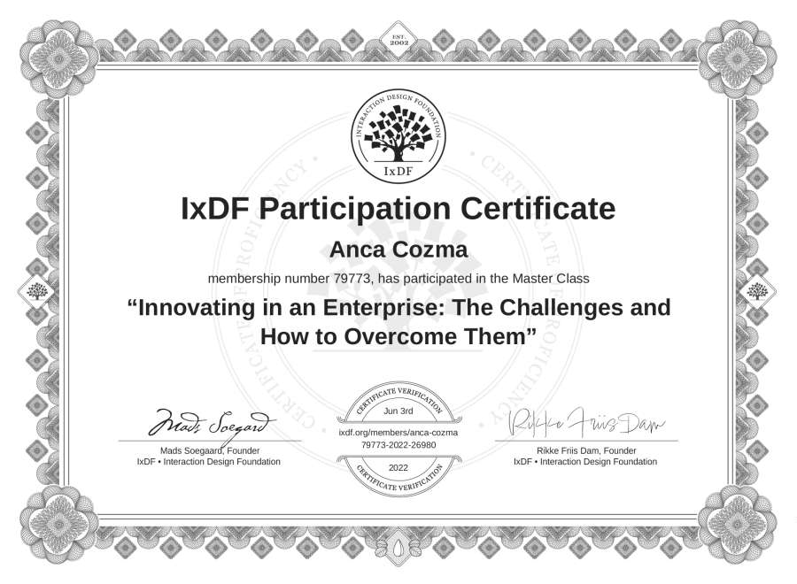 Anca Cozma's IxDF Masterclass Certificate: Innovating in an Enterprise: The Challenges and How to Overcome Them