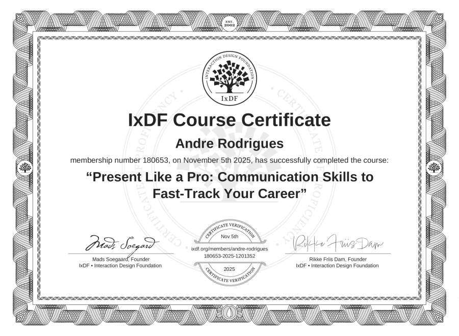 The IxDF Course Certificate above is awarded to André Rodrigues in formal recognition of their coursework surpassing the rigorous benchmarks of exceptional performance established by the IxDF Educational Codex.