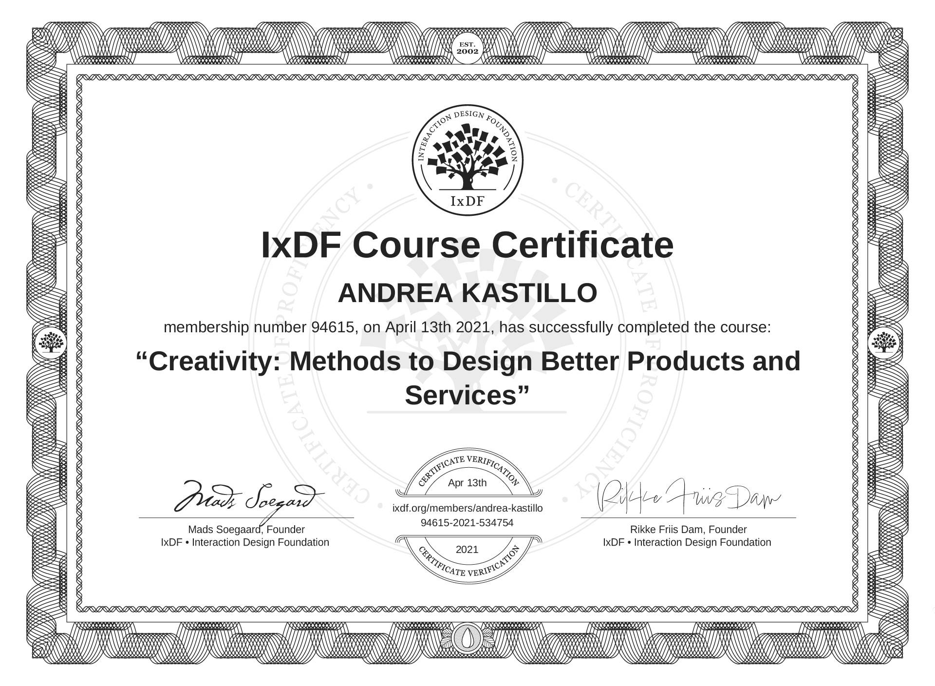 ANDREA KASTILLO's IxDF Course Certificate: Creativity: Methods to Design Better Products and Services