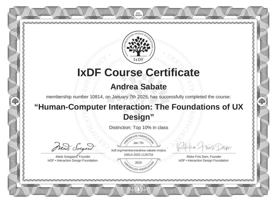 The IxDF Course Certificate above is awarded to Andrea Sabaté with a Top 10% Distinction in formal recognition of their coursework surpassing the rigorous benchmarks of exceptional performance established by the IxDF Educational Codex.
