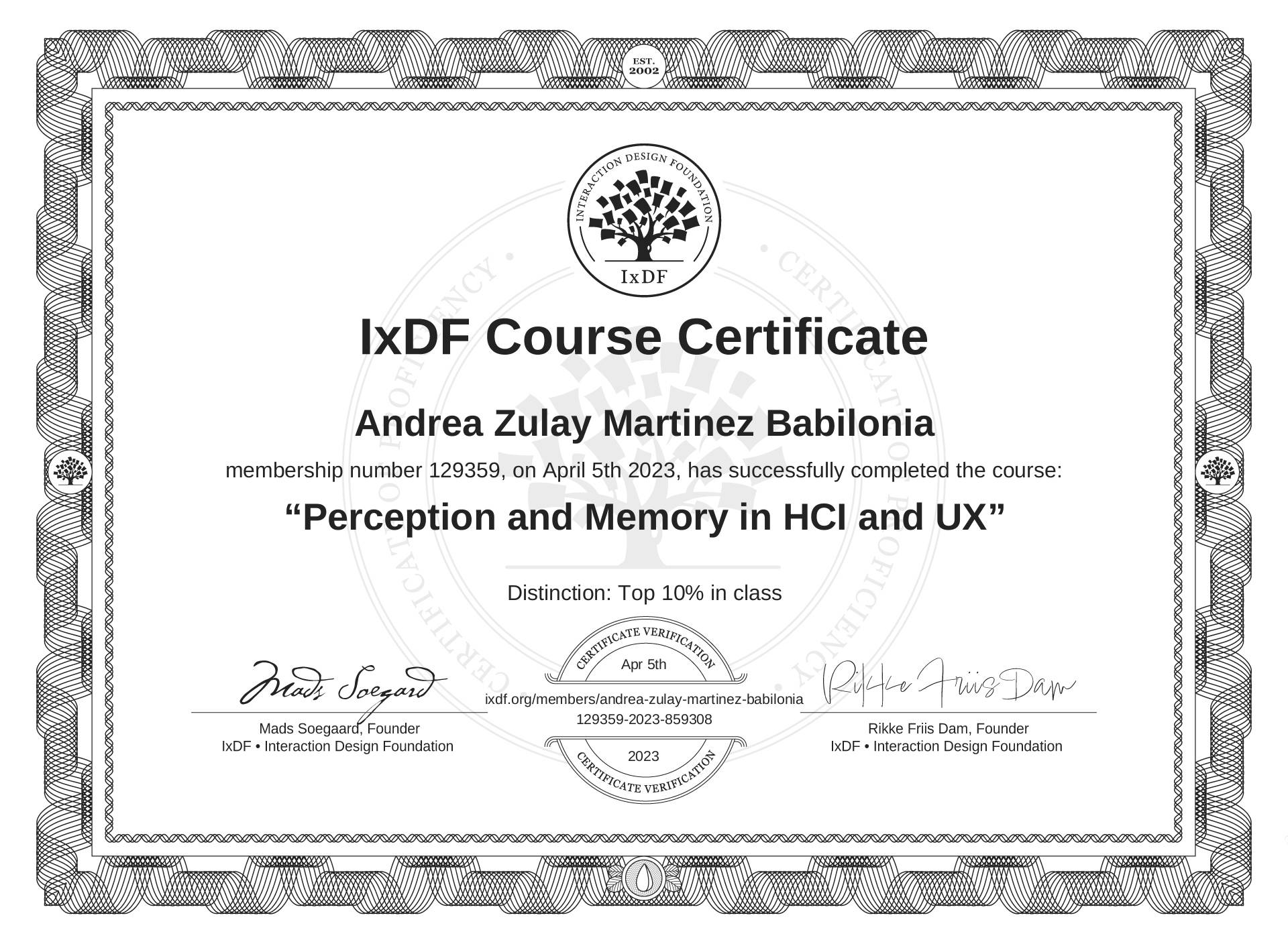 The IxDF Course Certificate above is awarded to Andrea Zulay Martínez Babilonia with a Top 10% Distinction in formal recognition of their coursework surpassing the rigorous benchmarks of exceptional performance established by the IxDF Educational Codex.