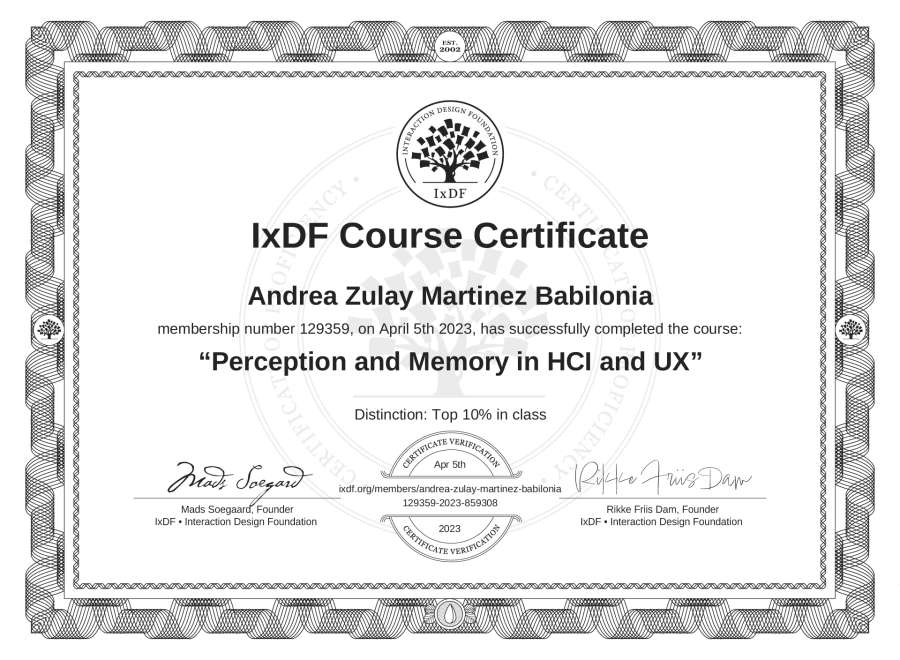 Andrea Zulay Martínez Babilonia's IxDF Course Certificate: Perception and Memory in HCI and UX