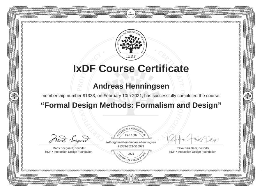 Andreas Henningsen's IxDF Course Certificate: Formal Design Methods: Formalism and Design