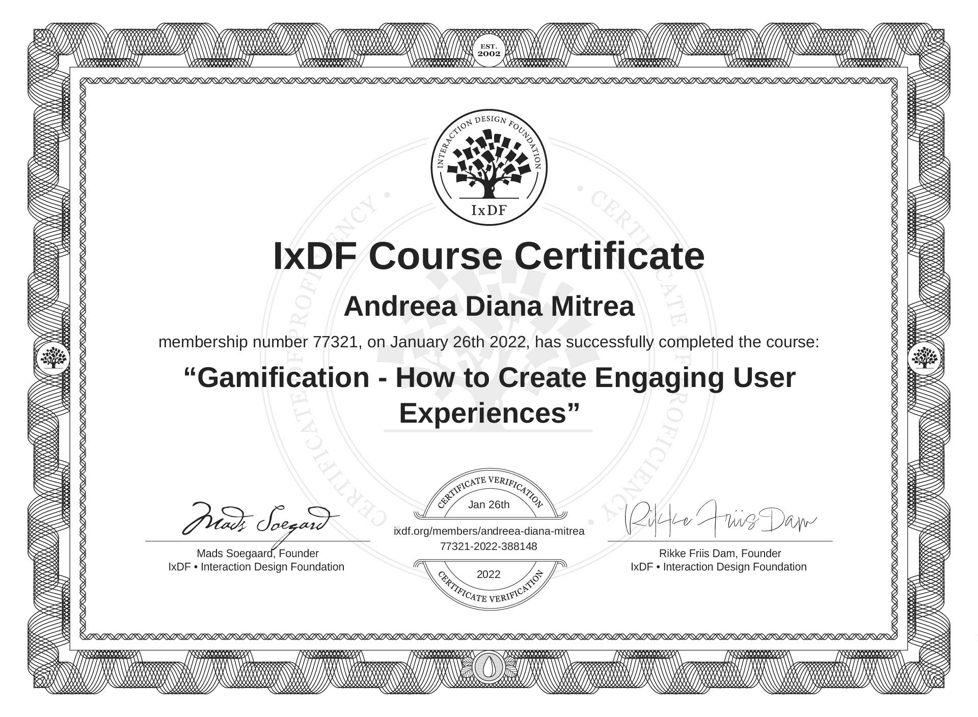 Andreea Diana Mitrea's IxDF Course Certificate: Gamification - How to Create Engaging User Experiences