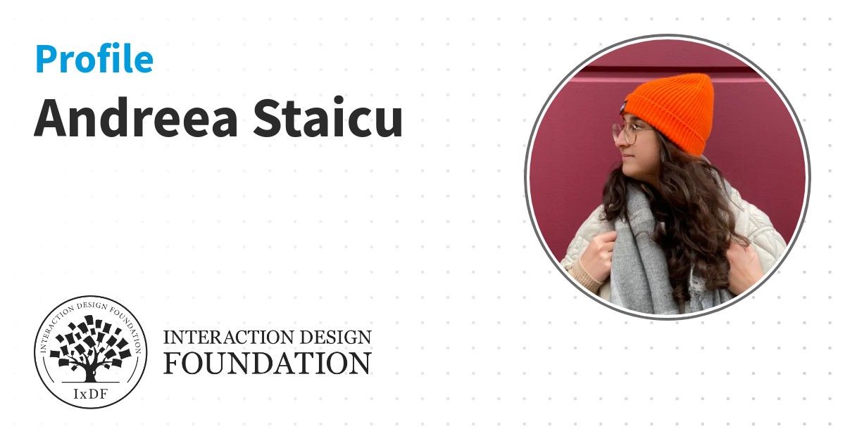 IxDF Course Certificates are awarded to Andreea Staicu in formal recognition of their coursework surpassing the rigorous benchmarks of exceptional performance established by the IxDF Educational Codex.