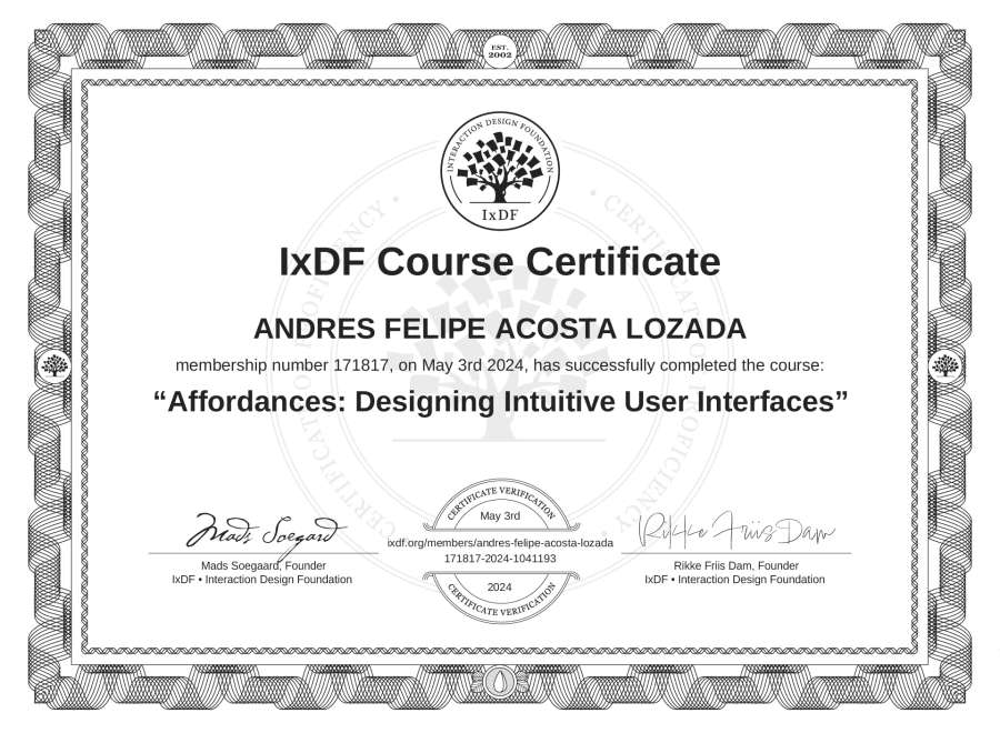 ANDRES FELIPE ACOSTA LOZADA's IxDF Course Certificate: Affordances: Designing Intuitive User Interfaces