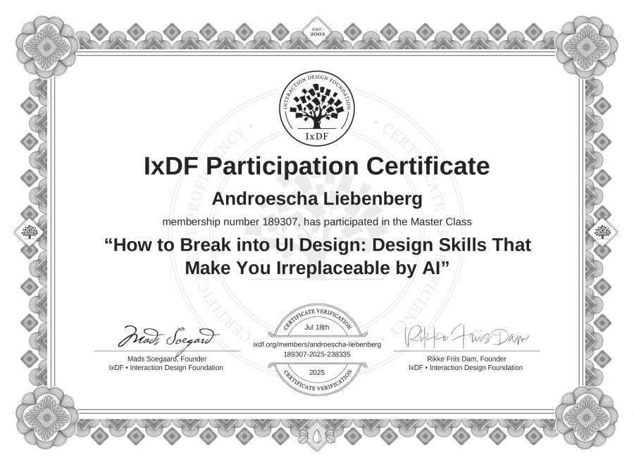 Androescha Liebenberg's IxDF Masterclass Certificate: How to Break into UI Design: Design Skills That Make You Irreplaceable by AI
