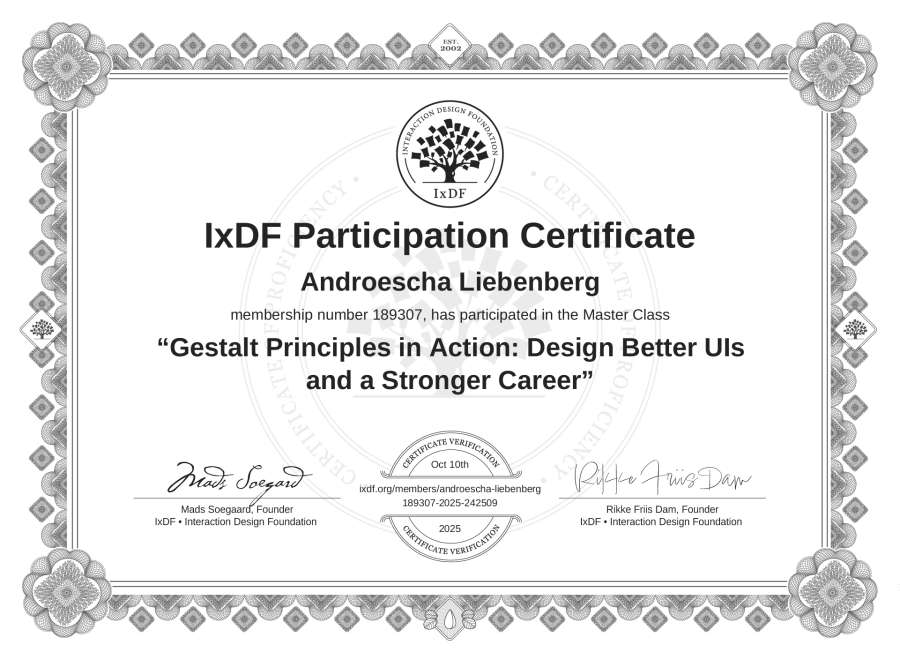Androescha Liebenberg's IxDF Masterclass Certificate: Gestalt Principles in Action: Design Better UIs and a Stronger Career
