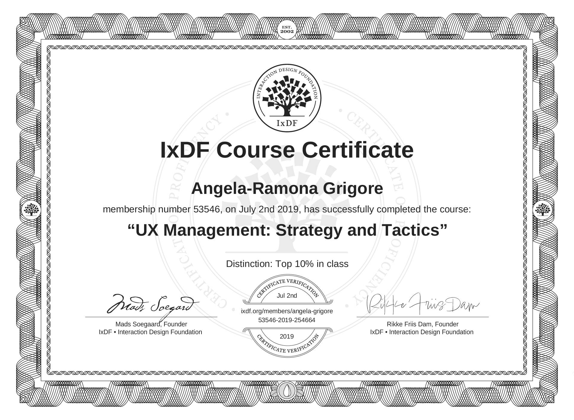 The IxDF Course Certificate above is awarded to Angela-Ramona Grigore with a Top 10% Distinction in formal recognition of their coursework surpassing the rigorous benchmarks of exceptional performance established by the IxDF Educational Codex.