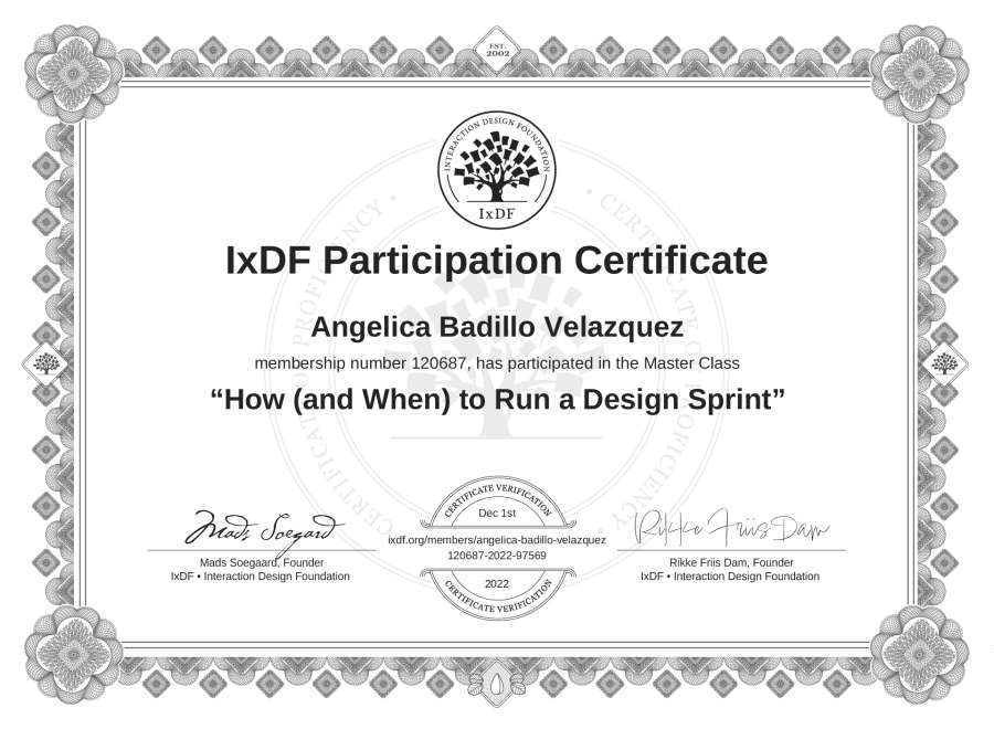 Angélica Badillo Velázquez's IxDF Masterclass Certificate: How (and When) to Run a Design Sprint