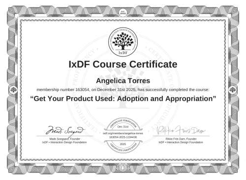 IxDF Course Certificates are awarded to Angelica Torres in formal recognition of their coursework surpassing the rigorous benchmarks of exceptional performance established by the IxDF Educational Codex.