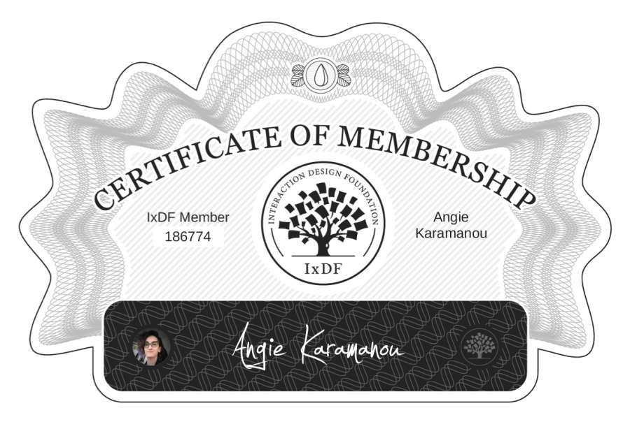 The Membership Certificate below verifies that Angie Karamanou is a member of Interaction Design Foundation.