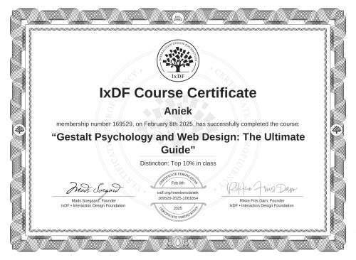IxDF Course Certificates are awarded to Aniek in formal recognition of their coursework surpassing the rigorous benchmarks of exceptional performance established by the IxDF Educational Codex.