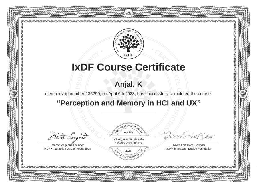 Anjal. K's IxDF Course Certificate: Perception and Memory in HCI and UX