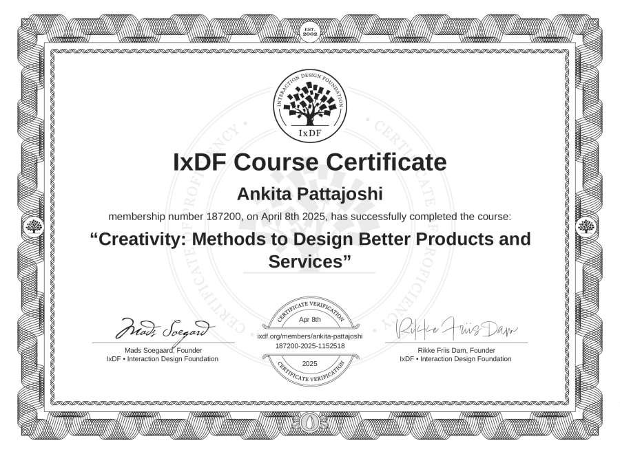 Ankita Pattajoshi's IxDF Course Certificate: Creativity: Methods to Design Better Products and Services