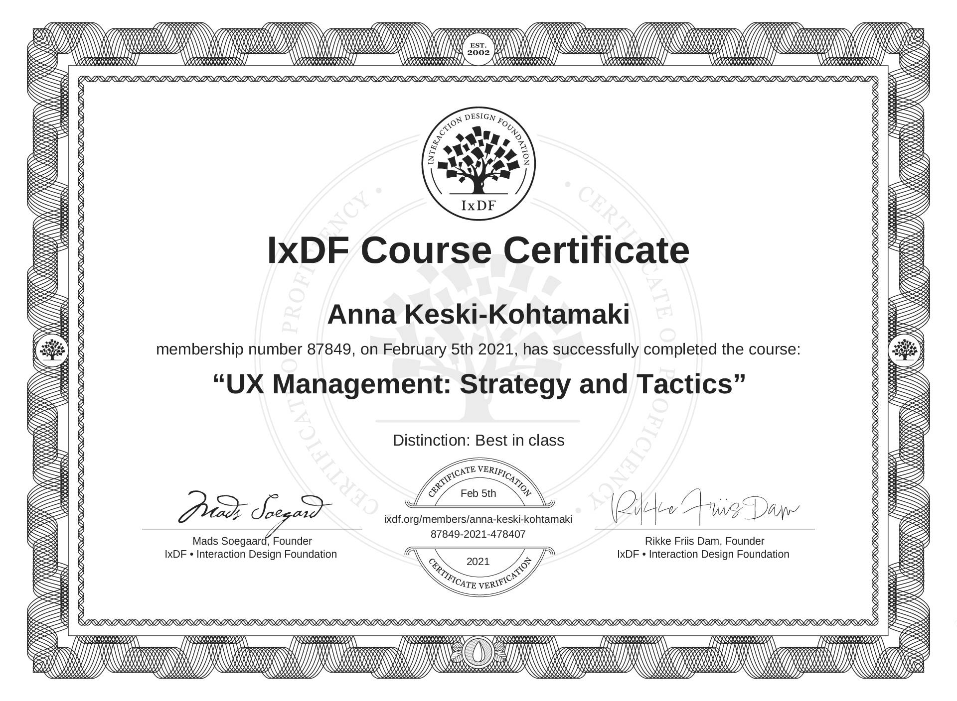 The IxDF Course Certificate above is awarded to Anna Keski-Kohtamäki with a Best in Class Distinction in formal recognition of their coursework surpassing the rigorous benchmarks of exceptional performance established by the IxDF Educational Codex.