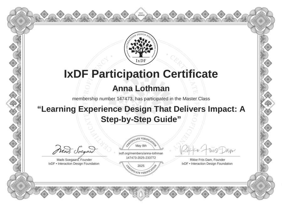 Anna Löthman's IxDF Masterclass Certificate: Learning Experience Design That Delivers Impact: A Step-by-Step Guide