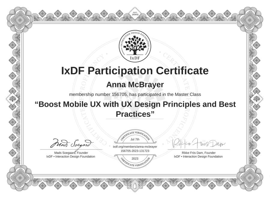 Anna McBrayer's IxDF Masterclass Certificate: Boost Mobile UX with UX Design Principles and Best Practices