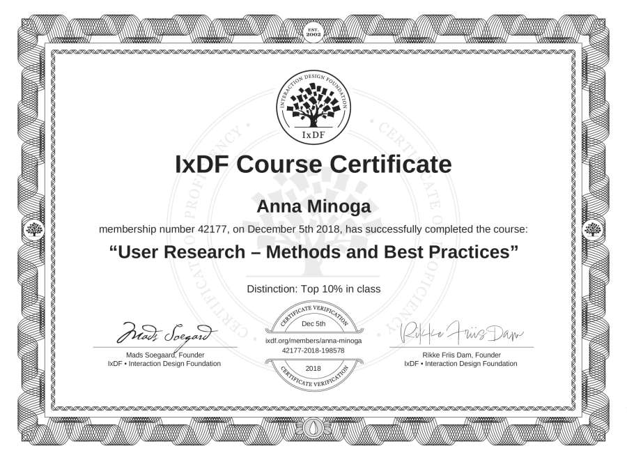 Anna Minoga's IxDF Course Certificate: User Research – Methods and Best Practices
