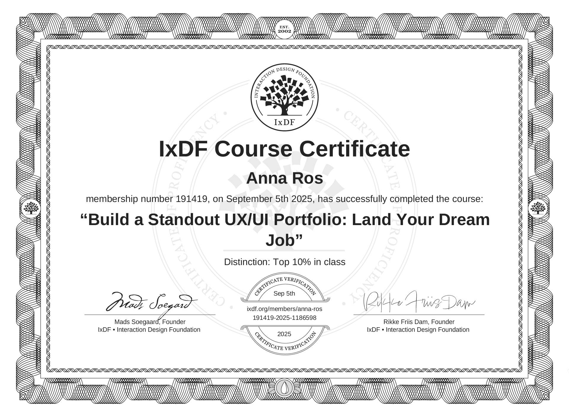The IxDF Course Certificate above is awarded to Anna Ros with a Top 10% Distinction in formal recognition of their coursework surpassing the rigorous benchmarks of exceptional performance established by the IxDF Educational Codex.