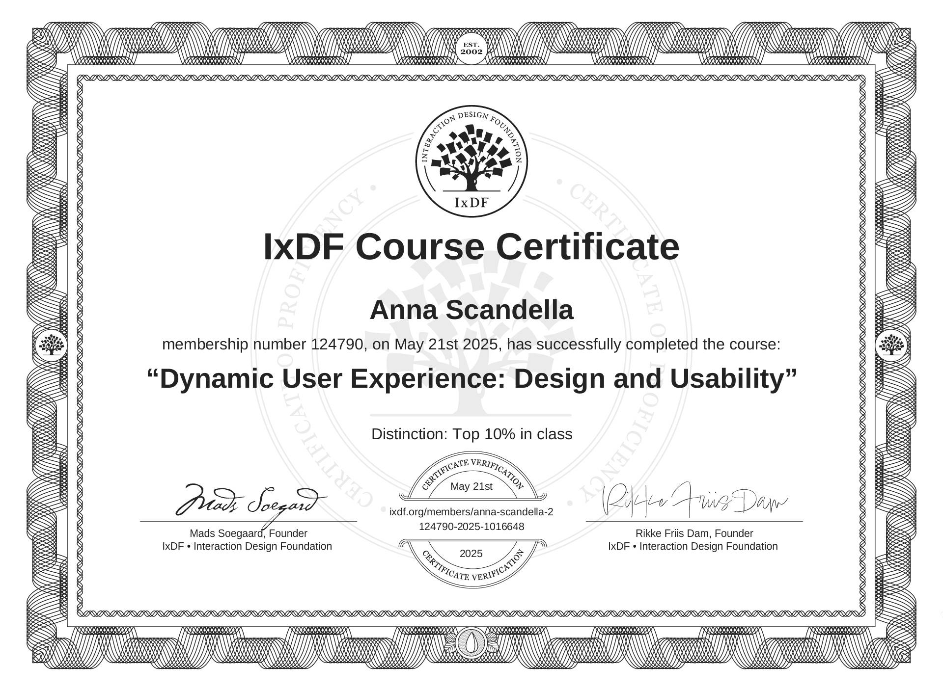 The IxDF Course Certificate above is awarded to Anna Scandella with a Top 10% Distinction in formal recognition of their coursework surpassing the rigorous benchmarks of exceptional performance established by the IxDF Educational Codex.