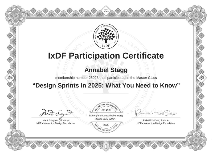 Annabel Stagg's IxDF Masterclass Certificate: Design Sprints in 2025: What You Need to Know