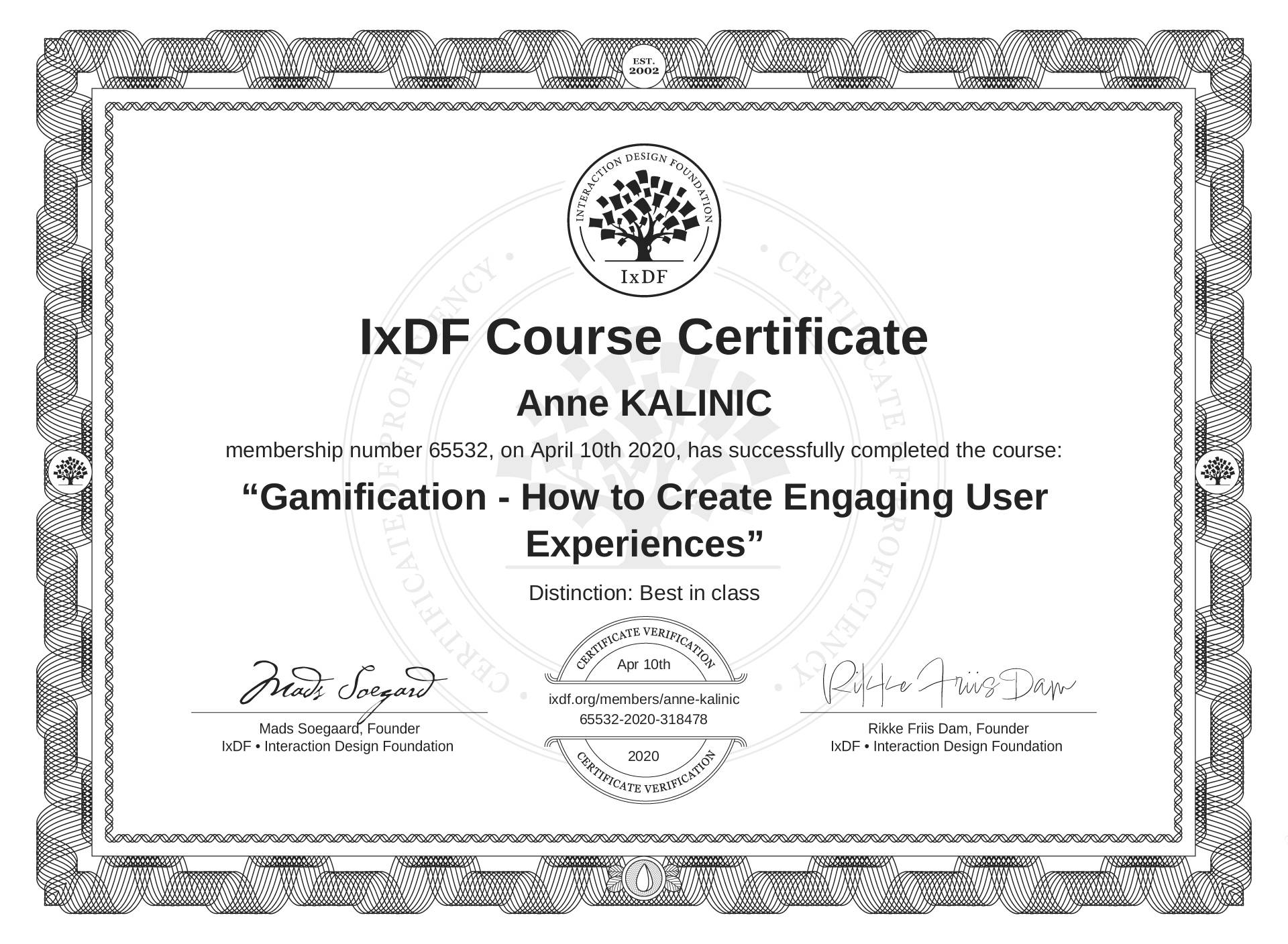 The IxDF Course Certificate above is awarded to Anne KALINIC with a Best in Class Distinction in formal recognition of their coursework surpassing the rigorous benchmarks of exceptional performance established by the IxDF Educational Codex.