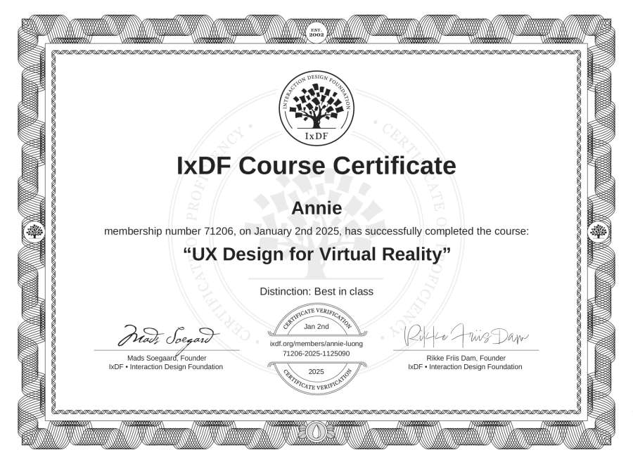 Annie's IxDF Course Certificate: UX Design for Virtual Reality