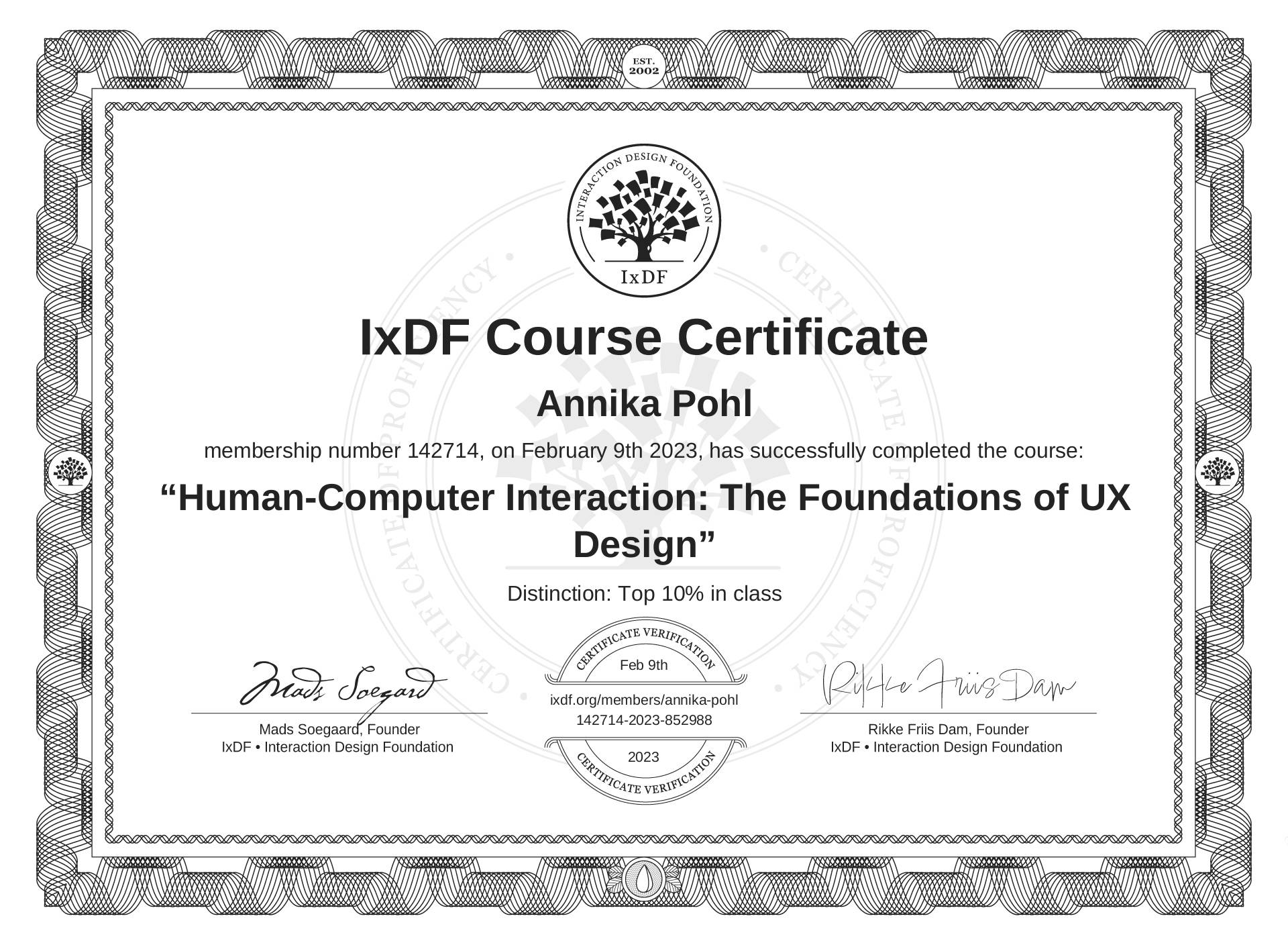 Annika Pohl's IxDF Course Certificate: Human-Computer Interaction: The Foundations of UX Design