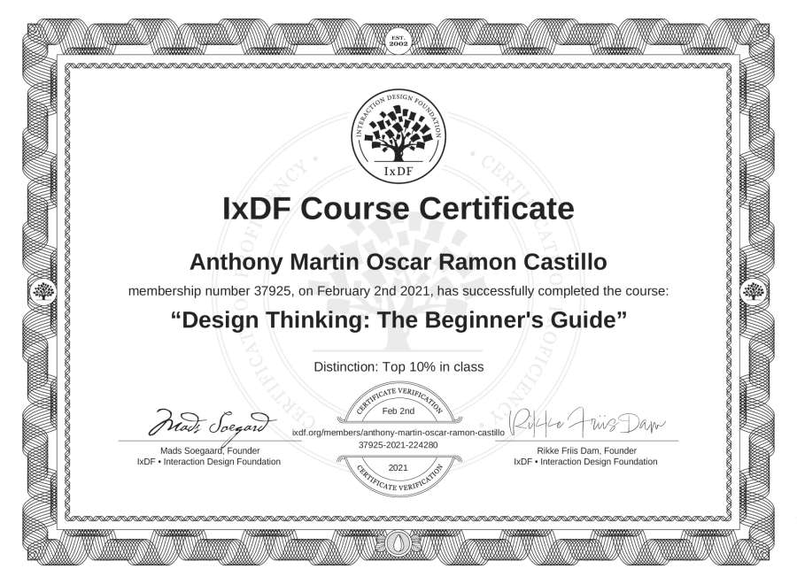 Anthony Martin Oscar Ramon Castillo's IxDF Course Certificate: Design Thinking: The Beginner's Guide