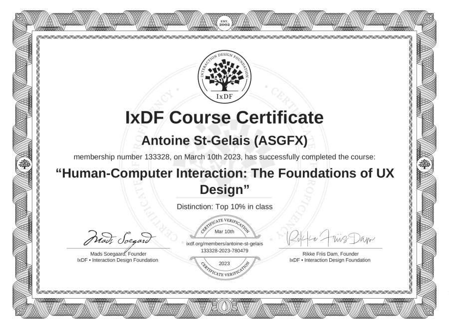 The IxDF Course Certificate above is awarded to Antoine St-Gelais (ASGFX) with a Top 10% Distinction in formal recognition of their coursework surpassing the rigorous benchmarks of exceptional performance established by the IxDF Educational Codex.