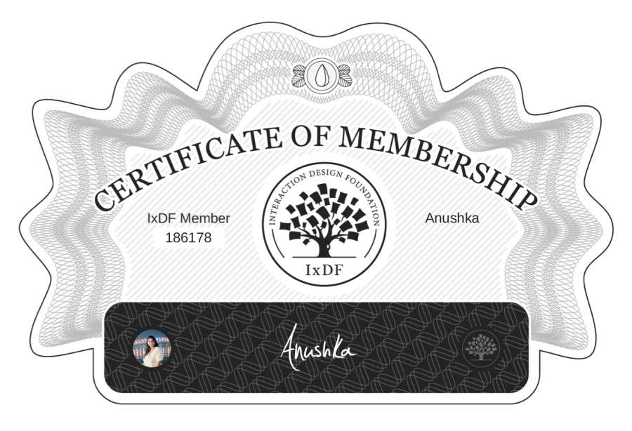 The Membership Certificate below verifies that Anushka is a member of Interaction Design Foundation.