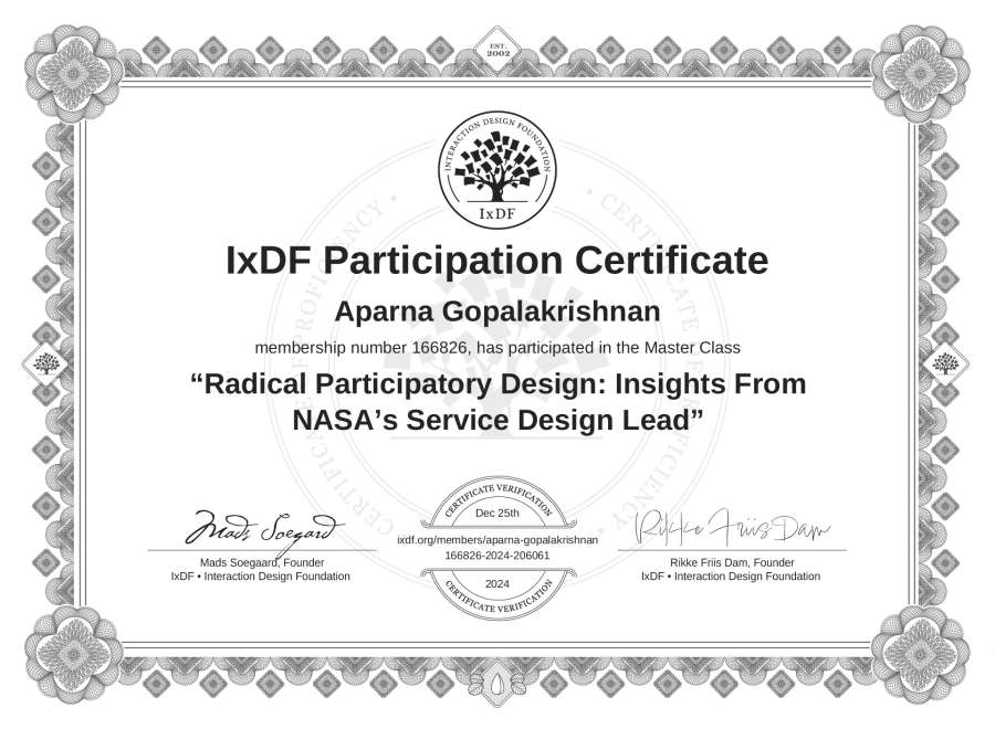 Aparna Gopalakrishnan's IxDF Masterclass Certificate: Radical Participatory Design: Insights From NASA’s Service Design Lead