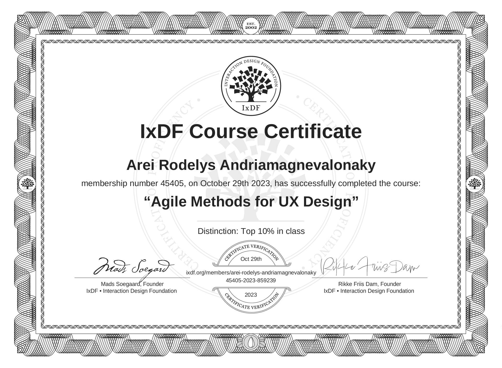 The IxDF Course Certificate above is awarded to Areï Rodelys Andriamagnevalonaky with a Top 10% Distinction in formal recognition of their coursework surpassing the rigorous benchmarks of exceptional performance established by the IxDF Educational Codex.