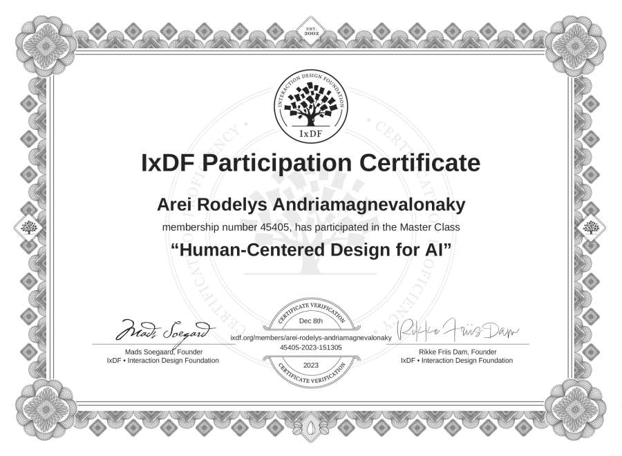 Areï Rodelys Andriamagnevalonaky's IxDF Masterclass Certificate: Human-Centered Design for AI