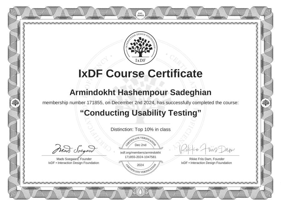 Armindokht Hashempour Sadeghian's IxDF Course Certificate: Conducting Usability Testing