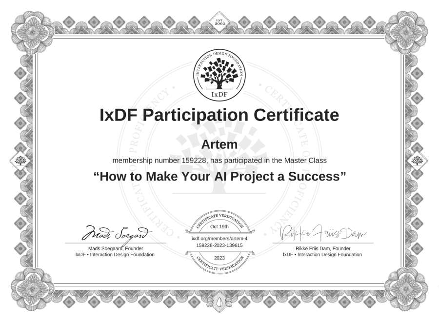 Artem's IxDF Masterclass Certificate: How to Make Your AI Project a Success