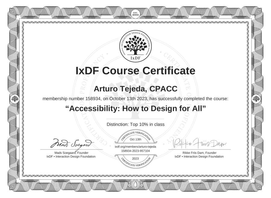 The IxDF Course Certificate above is awarded to Arturo Tejeda, CPACC with a Top 10% Distinction in formal recognition of their coursework surpassing the rigorous benchmarks of exceptional performance established by the IxDF Educational Codex.