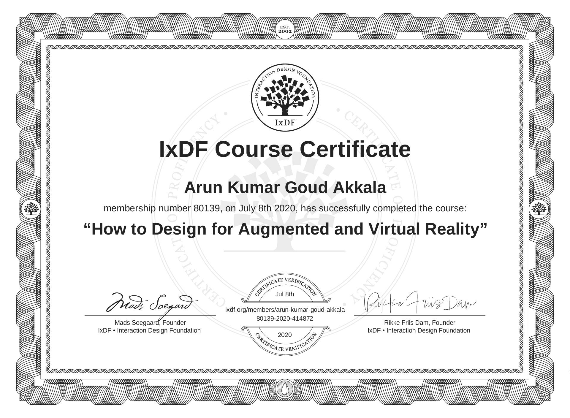 Arun Kumar Goud Akkala's IxDF Course Certificate: How to Design for Augmented and Virtual Reality