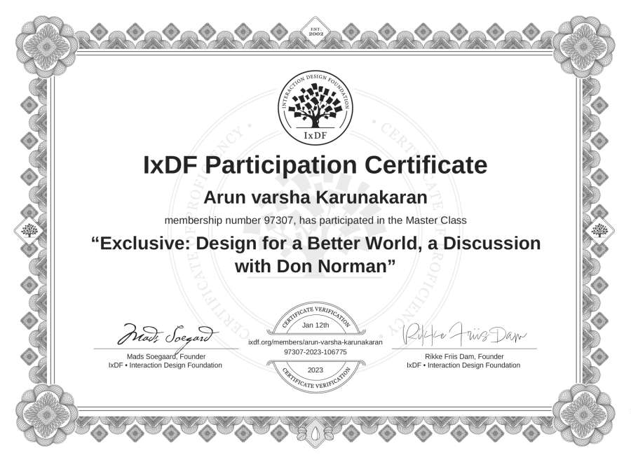 Arun varsha Karunakaran's IxDF Masterclass Certificate: Exclusive: Design for a Better World, a Discussion with Don Norman