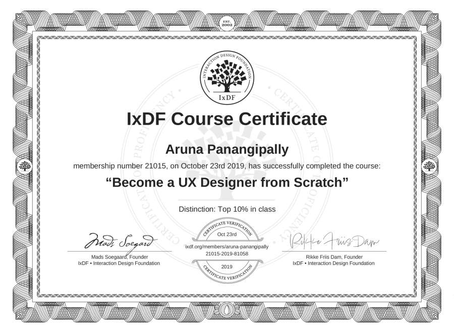 The IxDF Course Certificate above is awarded to Aruna Panangipally with a Top 10% Distinction in formal recognition of their coursework surpassing the rigorous benchmarks of exceptional performance established by the IxDF Educational Codex.