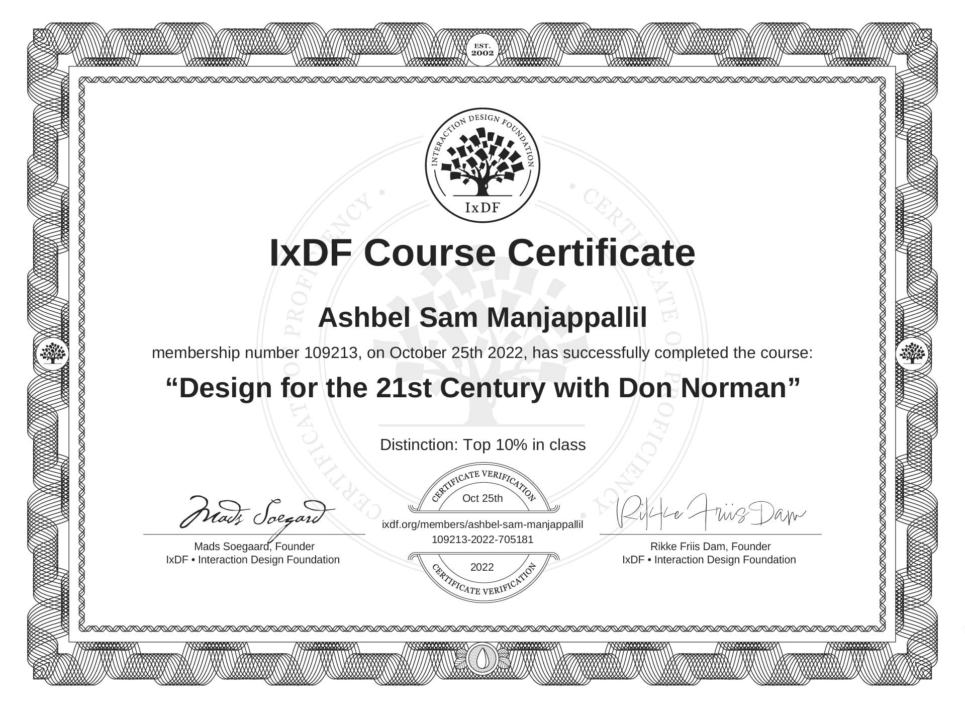 Ashbel Sam Manjappallil's IxDF Course Certificate: Design for the 21st Century with Don Norman