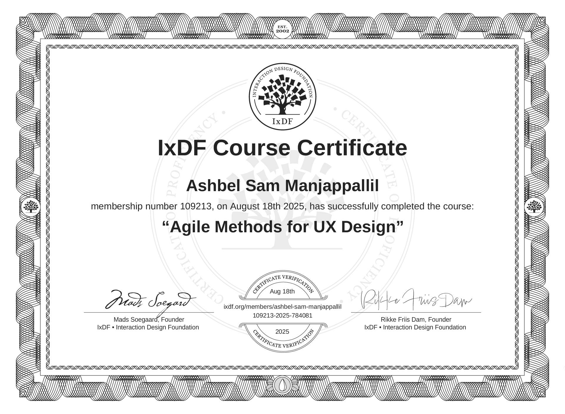 The IxDF Course Certificate above is awarded to Ashbel Sam Manjappallil in formal recognition of their coursework surpassing the rigorous benchmarks of exceptional performance established by the IxDF Educational Codex.