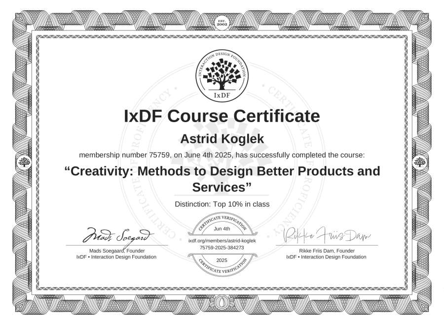The IxDF Course Certificate above is awarded to Astrid Koglek with a Top 10% Distinction in formal recognition of their coursework surpassing the rigorous benchmarks of exceptional performance established by the IxDF Educational Codex.
