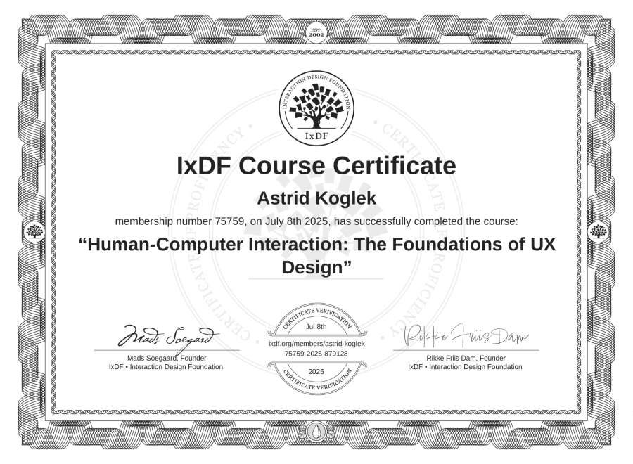 The IxDF Course Certificate above is awarded to Astrid Koglek in formal recognition of their coursework surpassing the rigorous benchmarks of exceptional performance established by the IxDF Educational Codex.